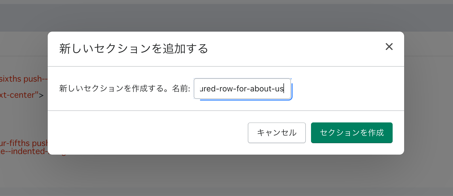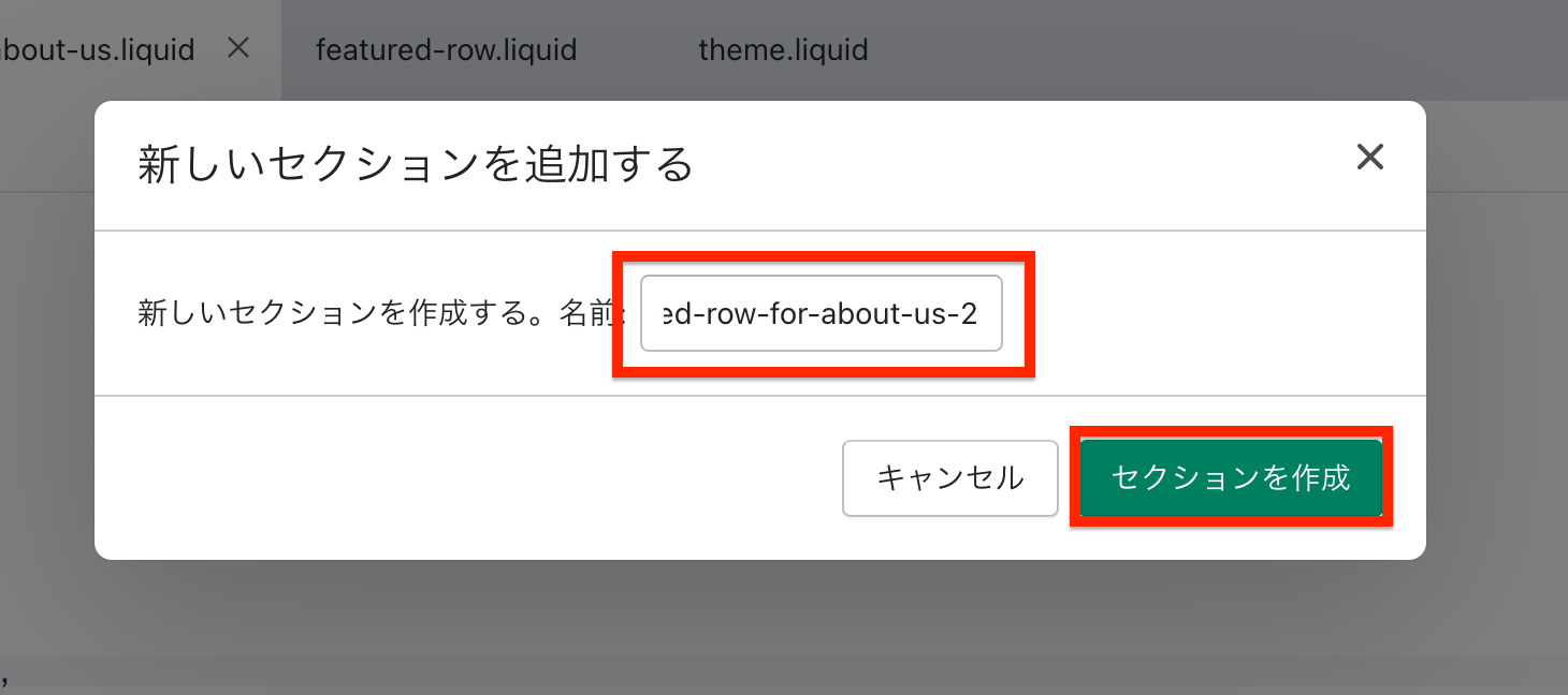 追加するセクションのファイル名を決めるモーダルが表示されるので、ファイル名を入力します。テキスト付き画像のセクション名は、「featured-row.liquid」なので、「featured-row-for-about-us」と入力しましょう。入力したら「セクションを作成」をクリックし、セクションを追加します。