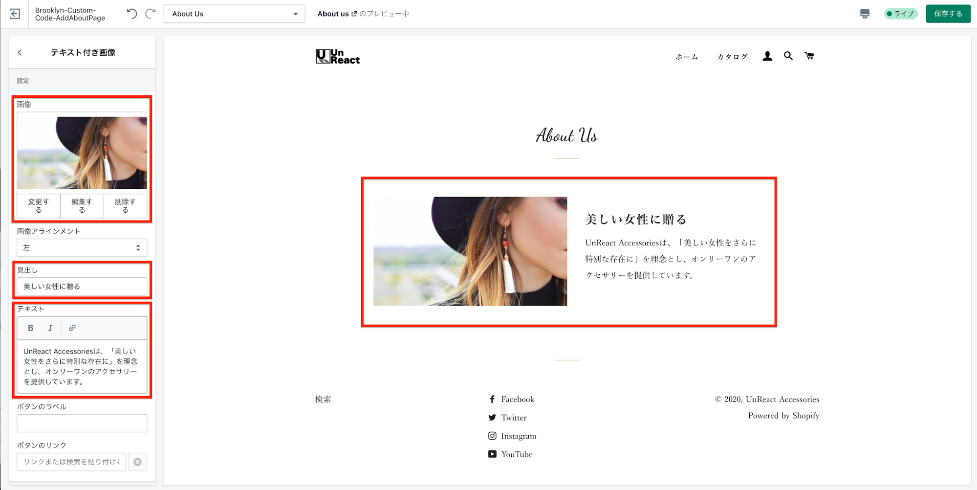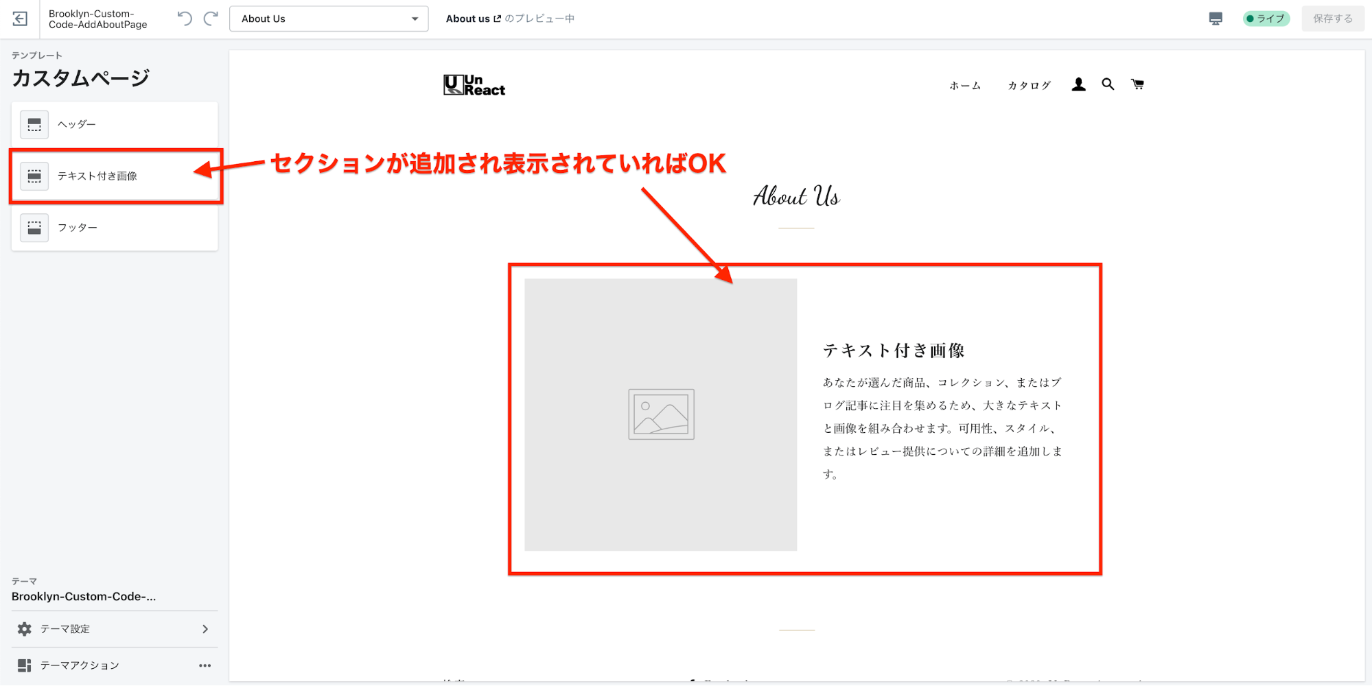 新たに About ページに追加したセクションに画像とテキストを追加します。セクションのカスタマイズの仕方はもう大丈夫ですよね?