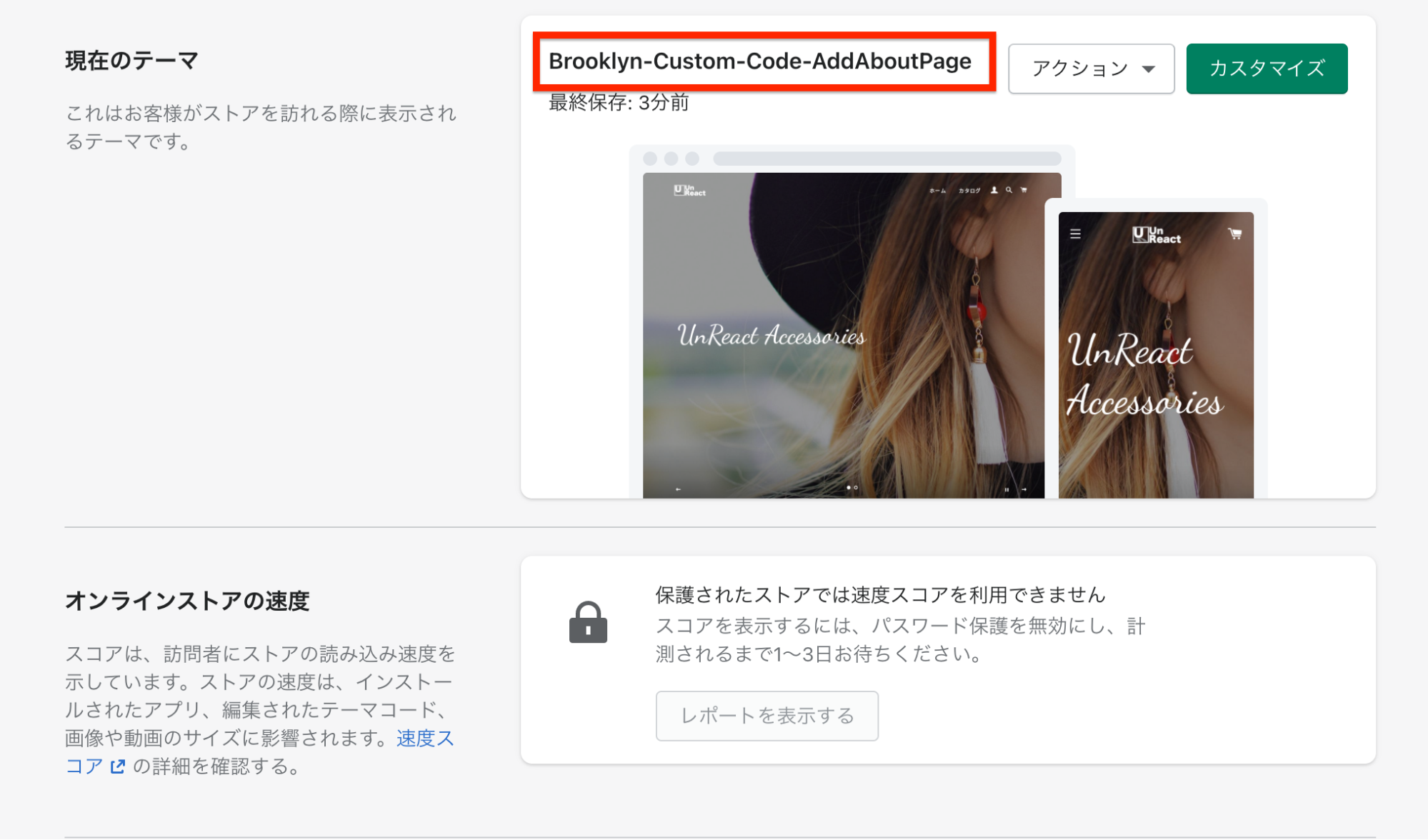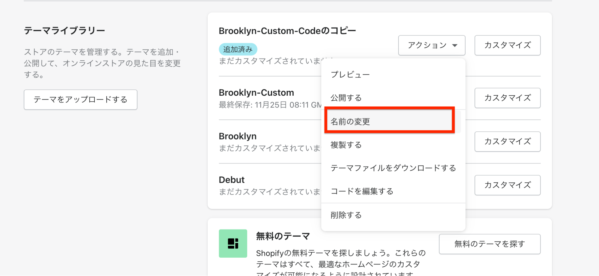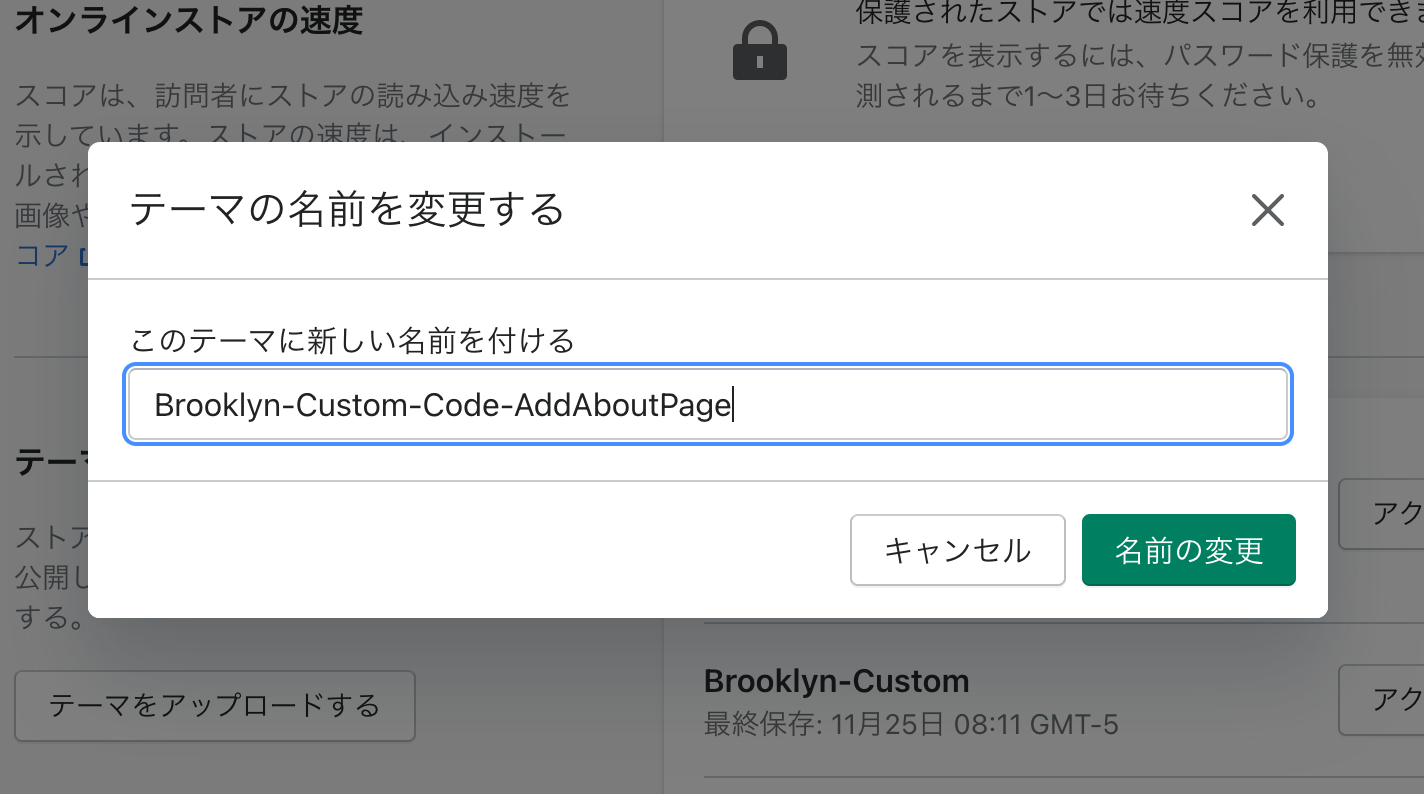 テーマの名前を変更しましょう。「テーマライブラリ > アクション > 名前の変更」から名前を変更します。「Brooklyn-Custom-Code-AddAboutPage」としておきます。
