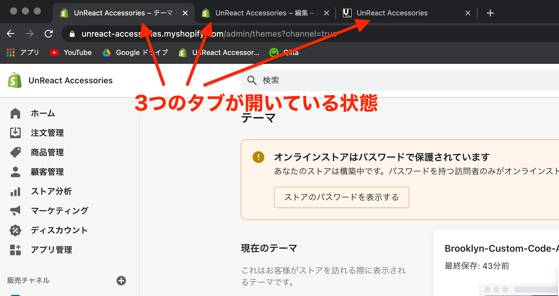 この段階で、「管理画面」「テーマのカスタマイズ画面」「コードの編集画面」が開いているようにします。