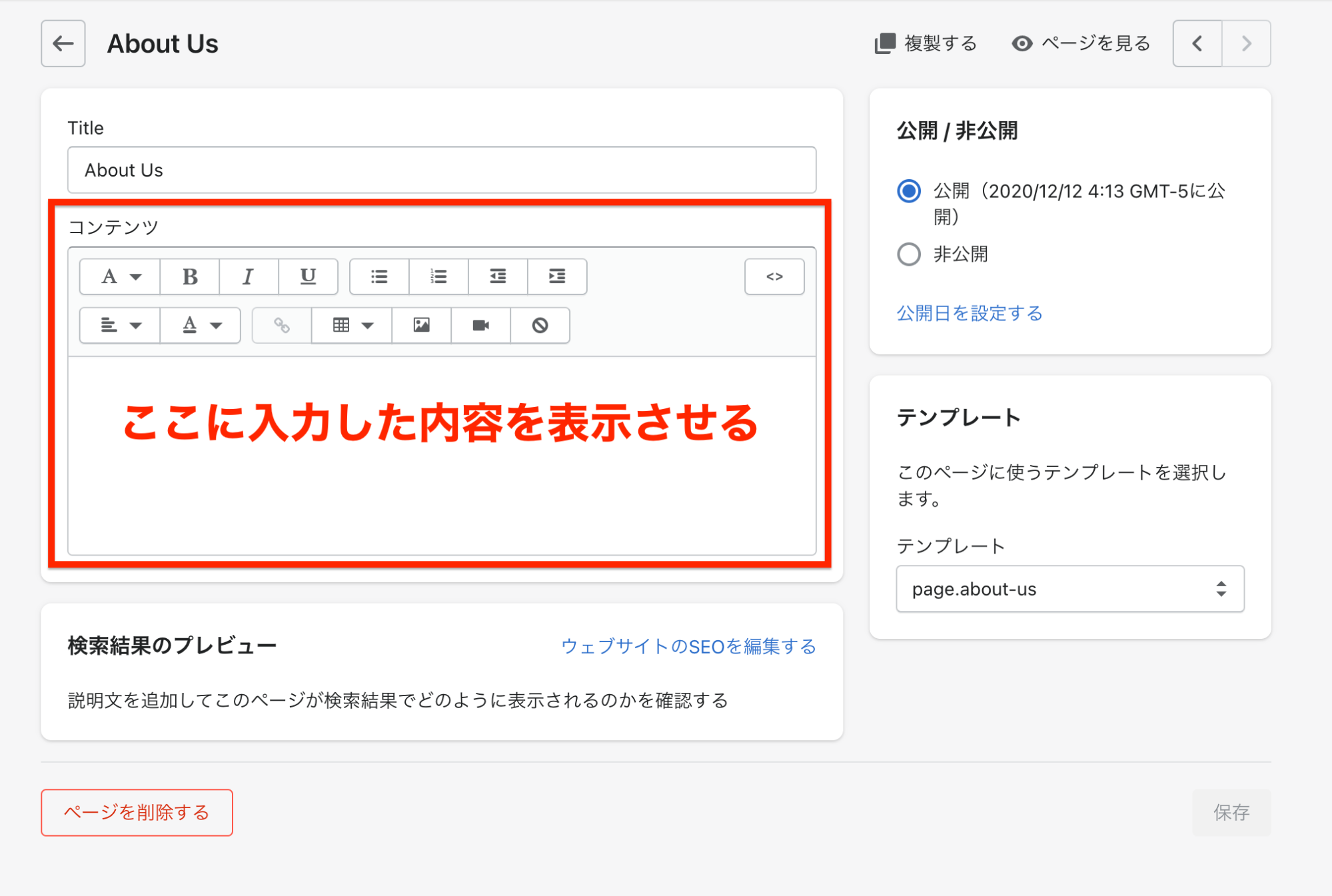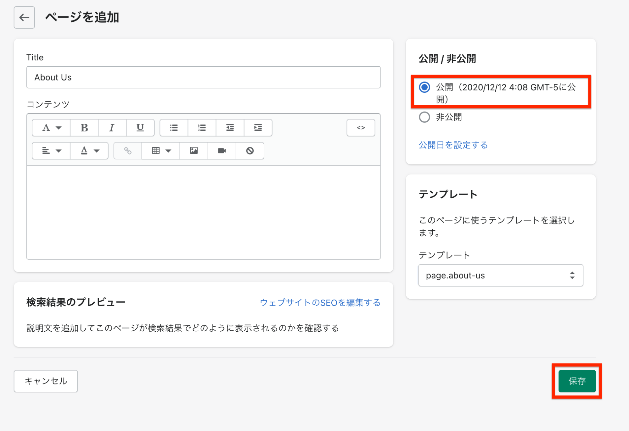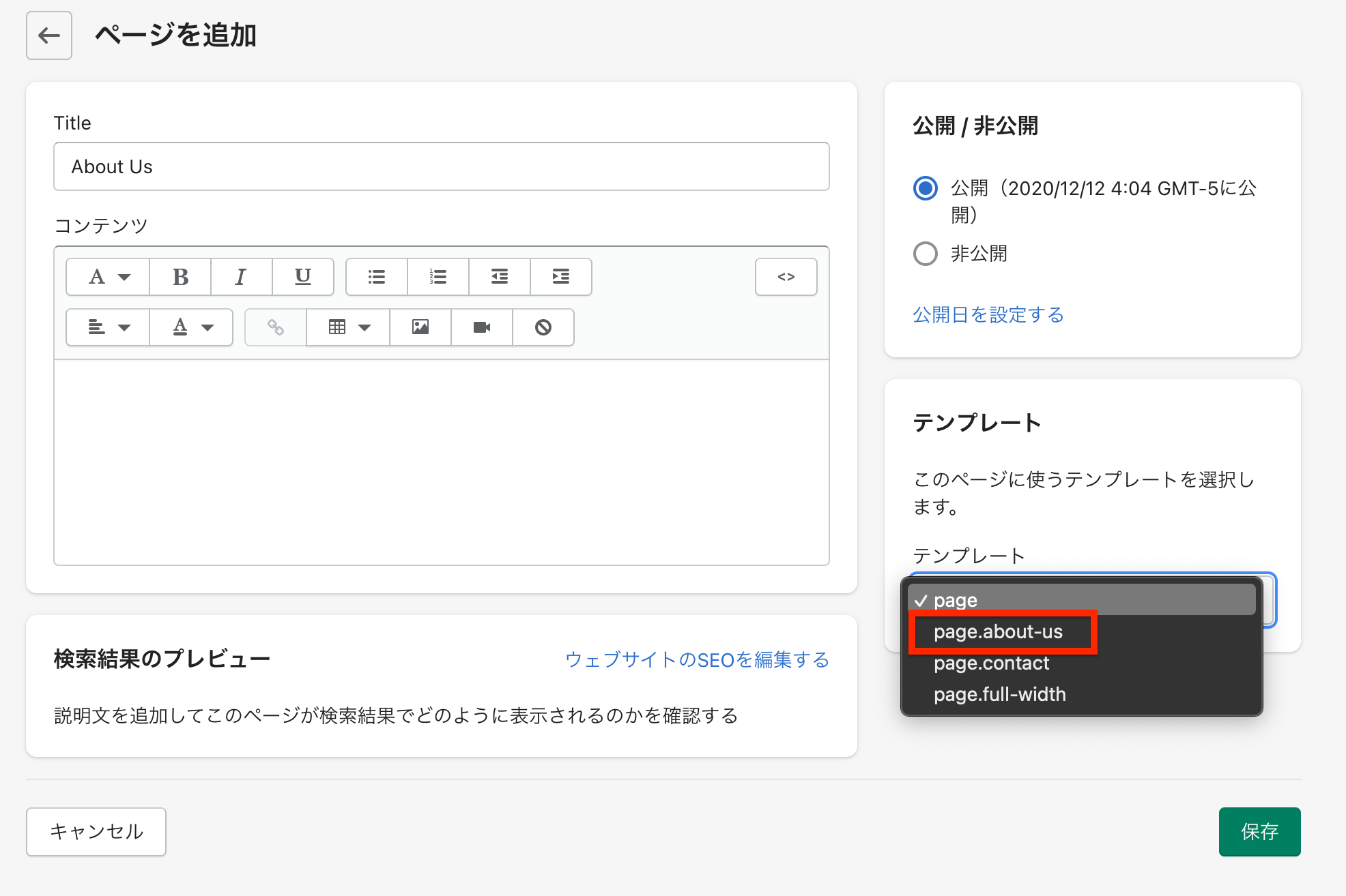 次が大事なところです。「テンプレート」を先ほど作成した「page.about-us」にします。この設定をすることで、新しく作成した About ページは「page.about-us.liquid」に記述されたレイアウト表示になります。