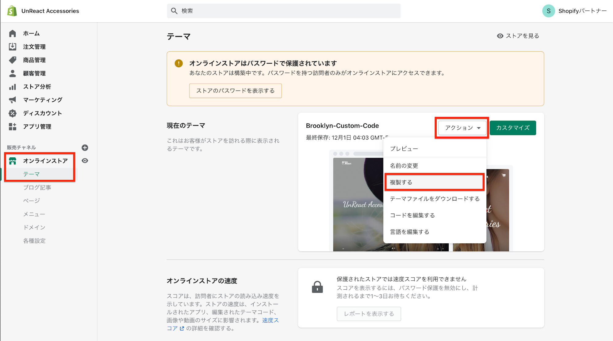 Shopify ストアの管理画面へログインします。コードを編集するので、テーマをコピーしておきます。「オンラインストア > テーマ > 現在のテーマ > アクション > 複製する」でテーマをコピーします。