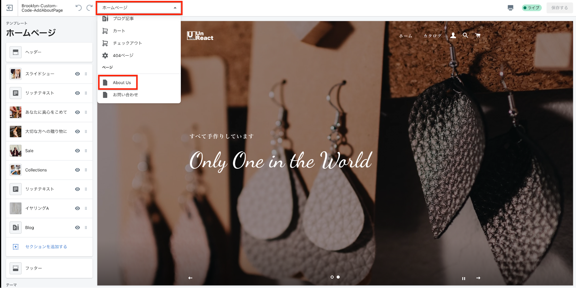 ページが作成されていることを確認します。テーマのカスタマイズ画面へ移動し、「About Us」ページのカスタマイズ画面を開きます。「About Us」が表示されない場合は、ページを一度リロードしてみてください。それでも表示されなければ、管理画面で正常にページが作成されているか確認しましょう。
