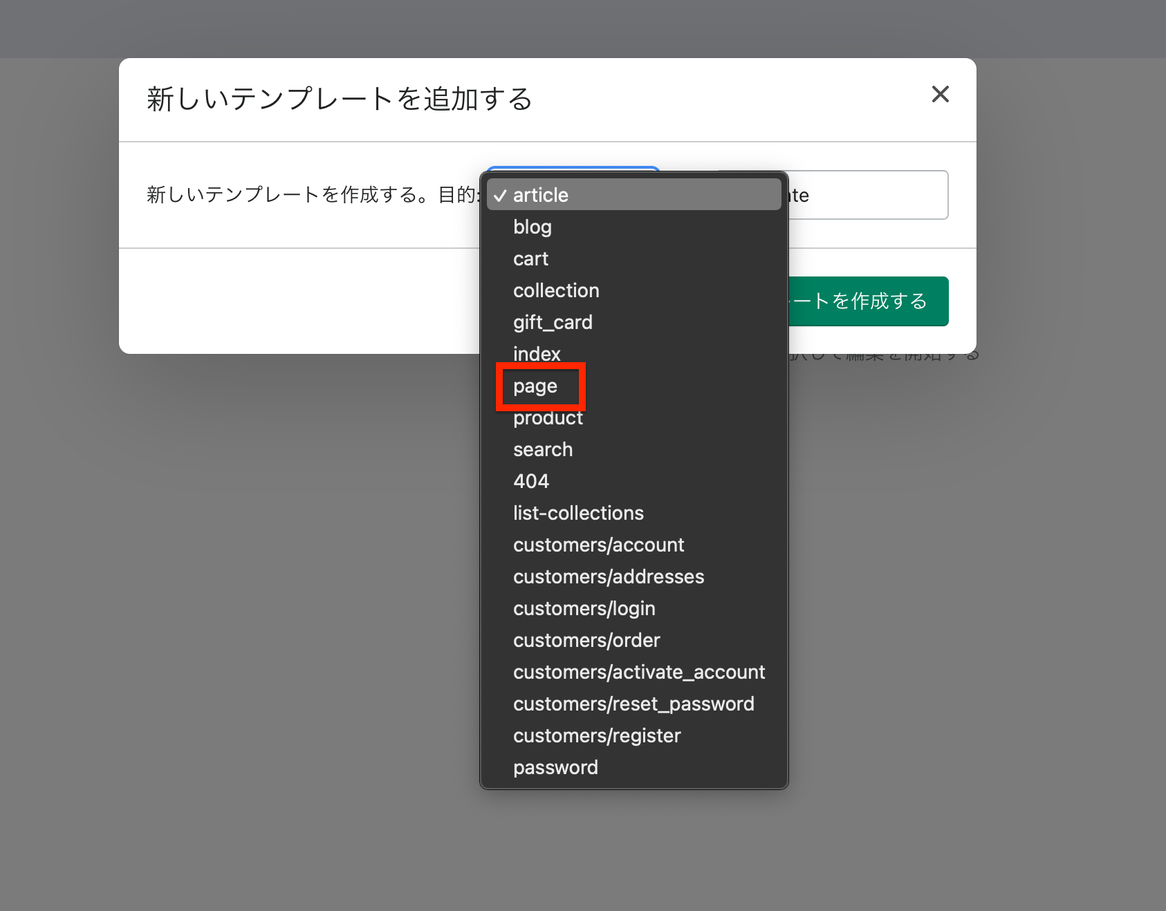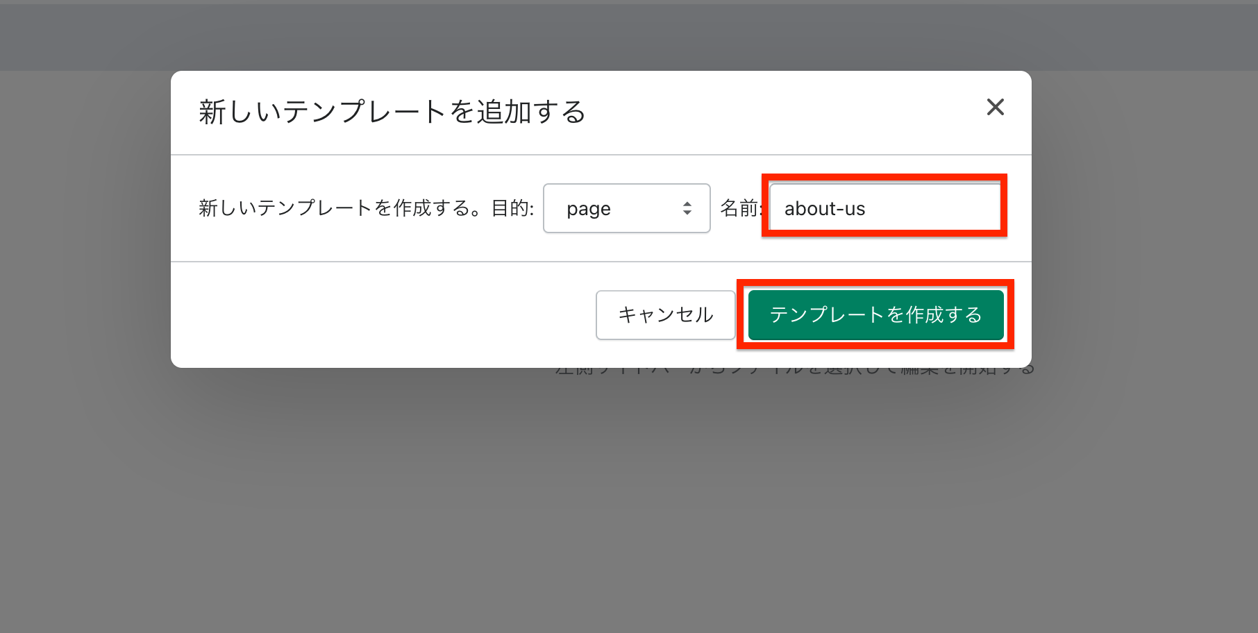 モーダルが開き、追加するテンプレートの「目的」と「名前」を入力するように求められます。「目的」はドロップダウンメニューの中から「page」を選び、「名前」には「about-us」と入力してください。入力したら「テンプレートを作成する」をクリックしましょう。