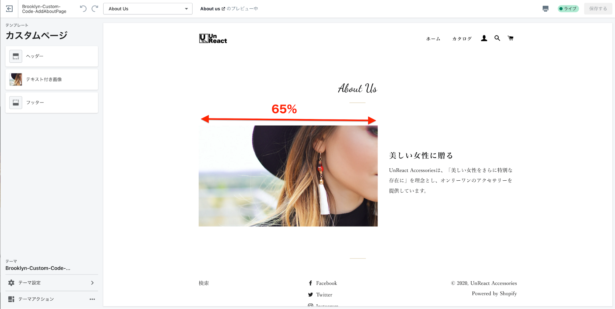新たに作成したテキスト付き画像セクションの画像とテキストの幅の割合を 65%と 35%になるように編集していきます。
