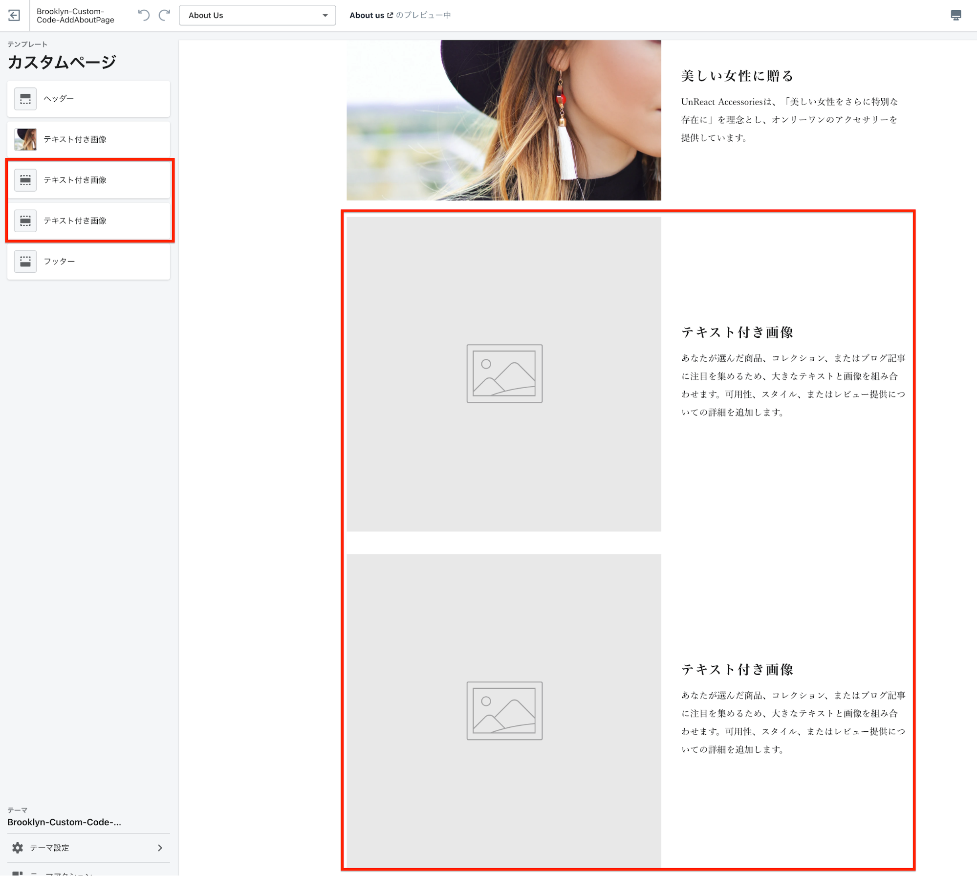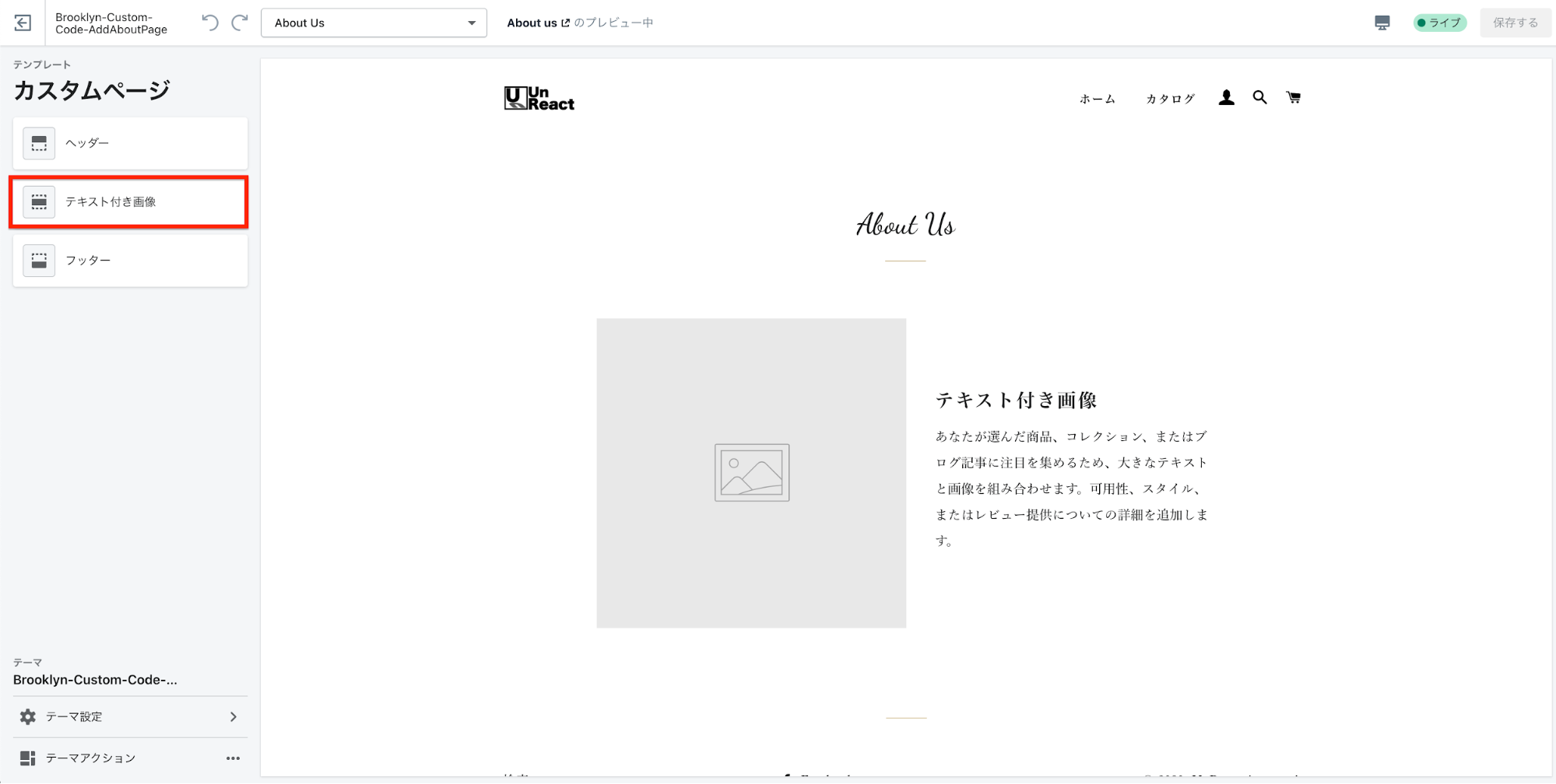 それでは、About ページにセクションを追加していきます。コードの編集画面を開きます。既存のテキスト付き画像のセクションのコードを元に作成します。
