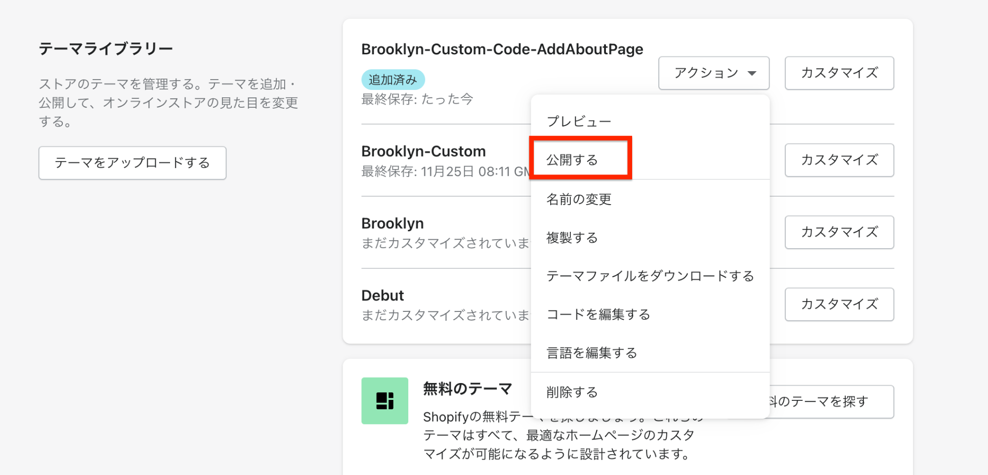 複製したテーマを公開します。「テーマライブラリー > アクション > 公開する」でテーマを公開してください。モーダルが出てくるので、「公開する」をクリックしましょう。