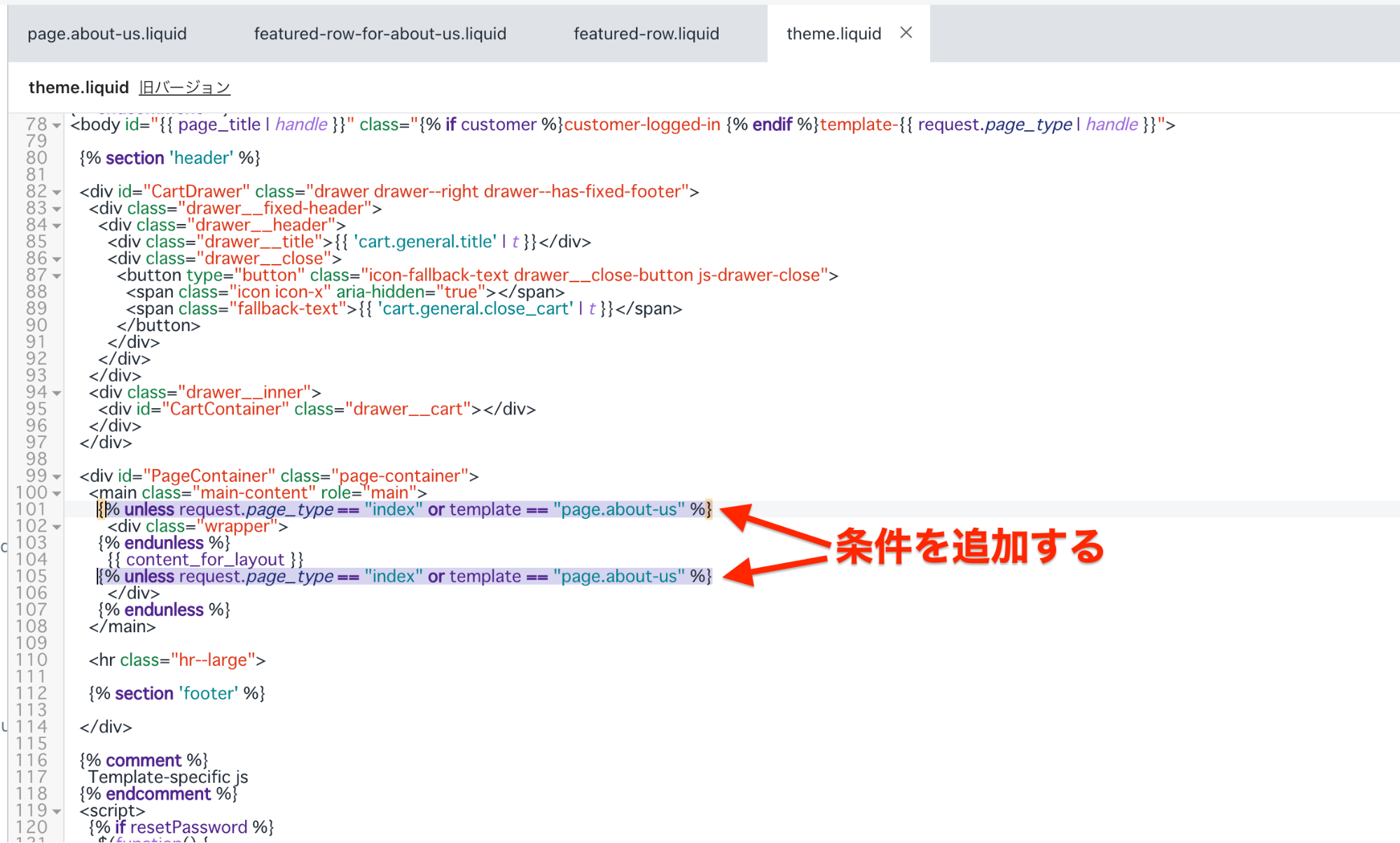 これを「page.about-us.liquid」テンプレートを読み込む時も適用させないようにしたいので、以下のような記述に書き換えます。