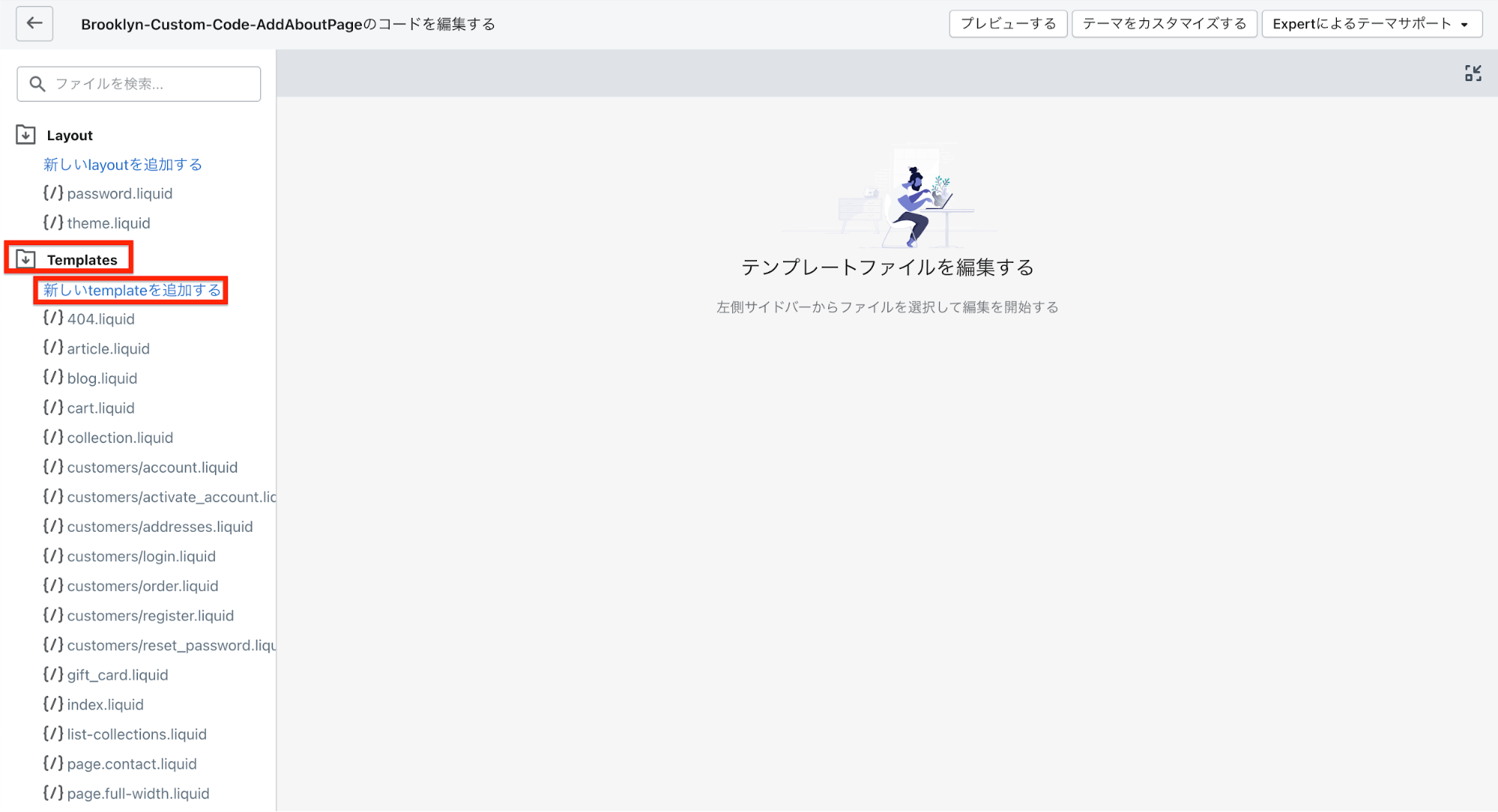 では、新しいページテンプレートである「page.about-us.liquid」ファイルを作成します。