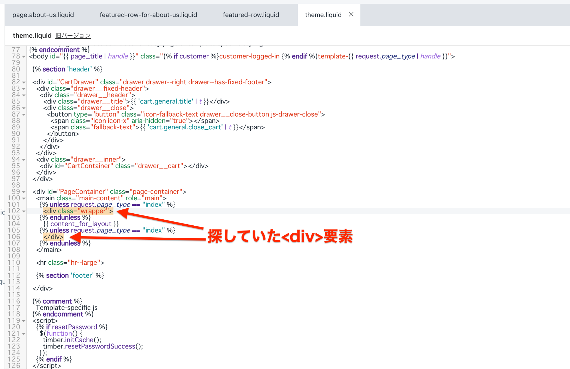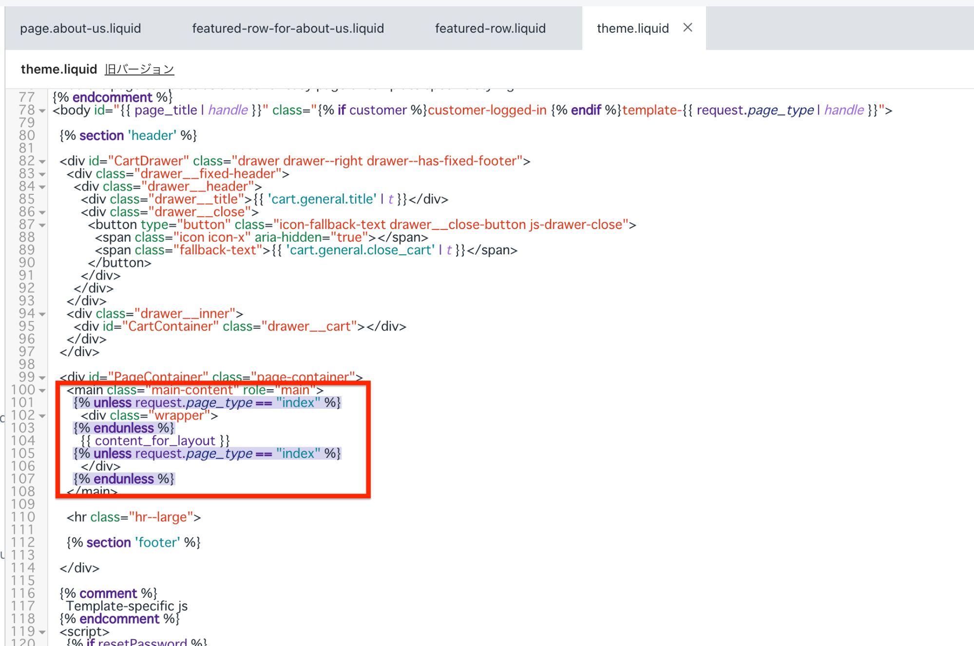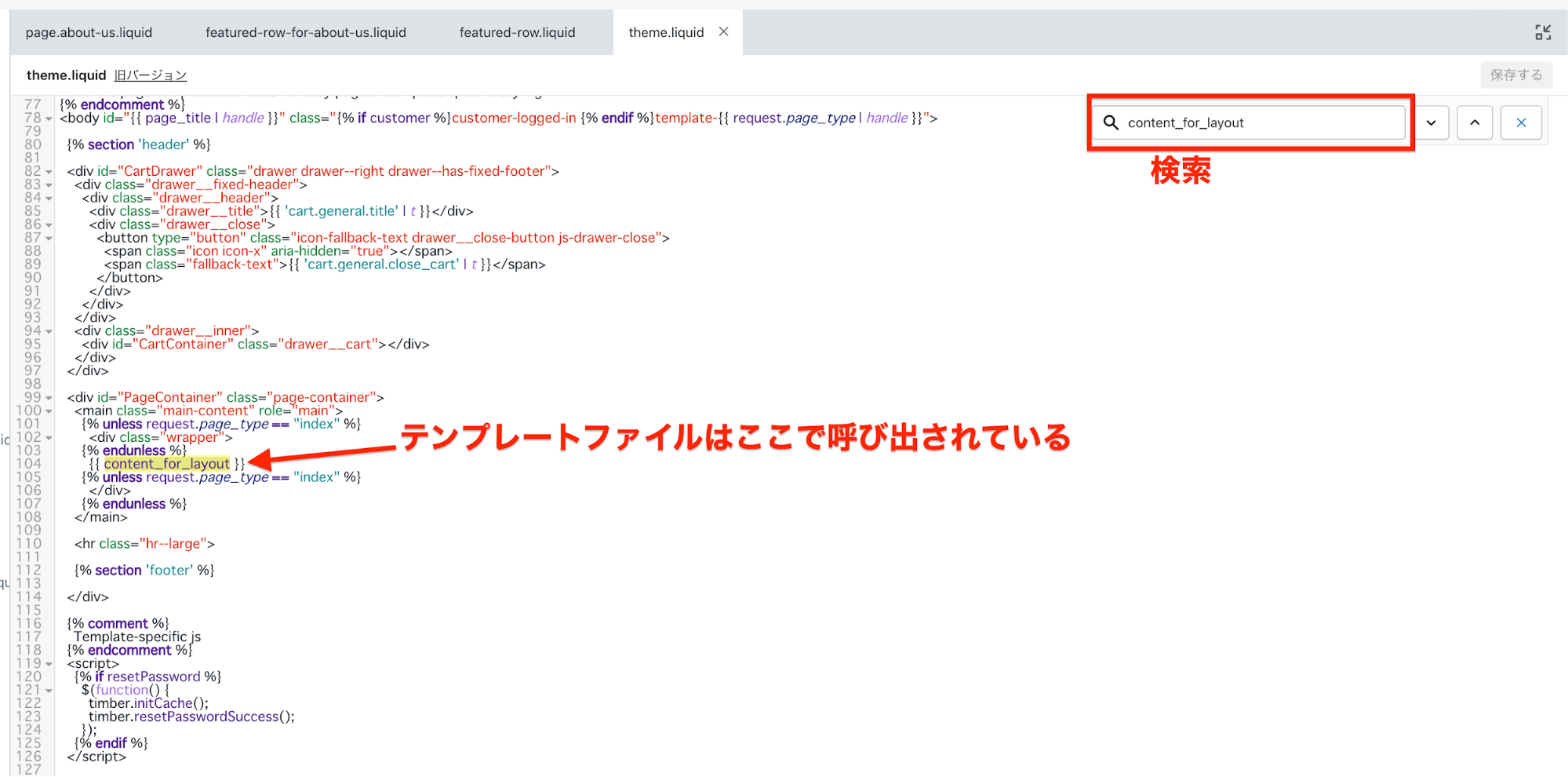 では、作成した「featured-row-for-about-us.liquid」ファイルを「page.about-us.liquid」ファイルで呼び出します。
