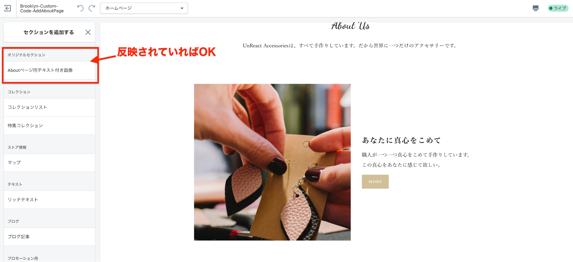 - 作成した About ページ用のセクションを page.about-us.liquid で呼び出す