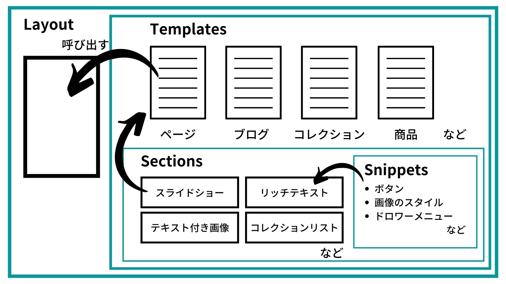 liquid ファイルには、親子関係が存在します。親子関係は「Layout > Templates > Sections > Snippets」となっています。
