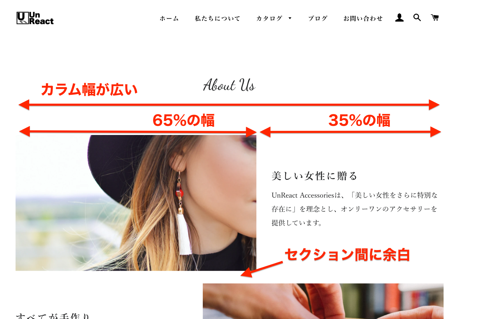 Shopify のデフォルトのページだと、リッチなレイアウトのページを作成することができません。そこで、新たなページテンプレートを作成し、既存のセクションのコードを書き換えることで About ページを作成します。