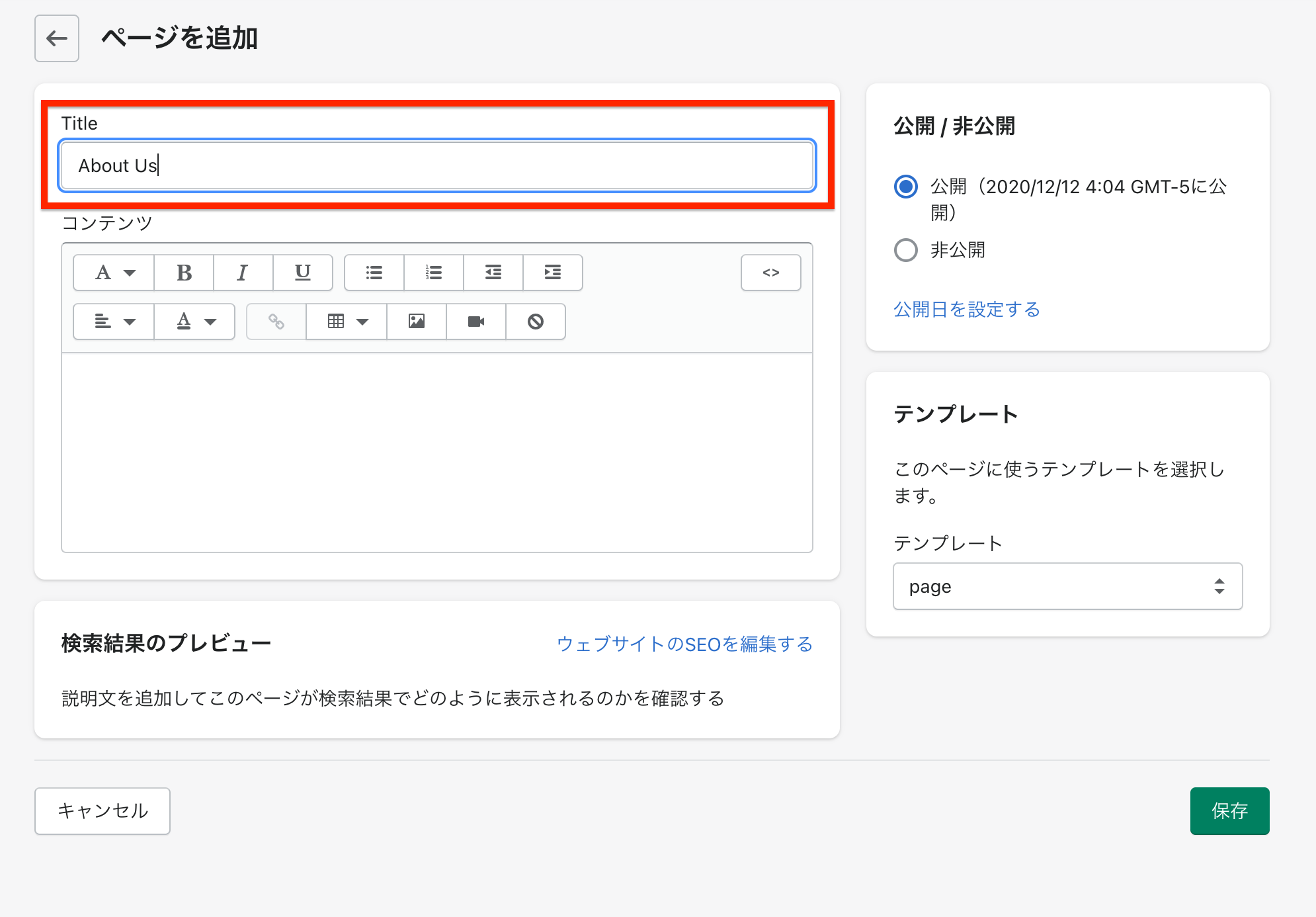 ページを追加したら「Title」を入力します。「Title」には「About Us」と入力しましょう。「コンテンツ」は何にも入力しなくて大丈夫です。