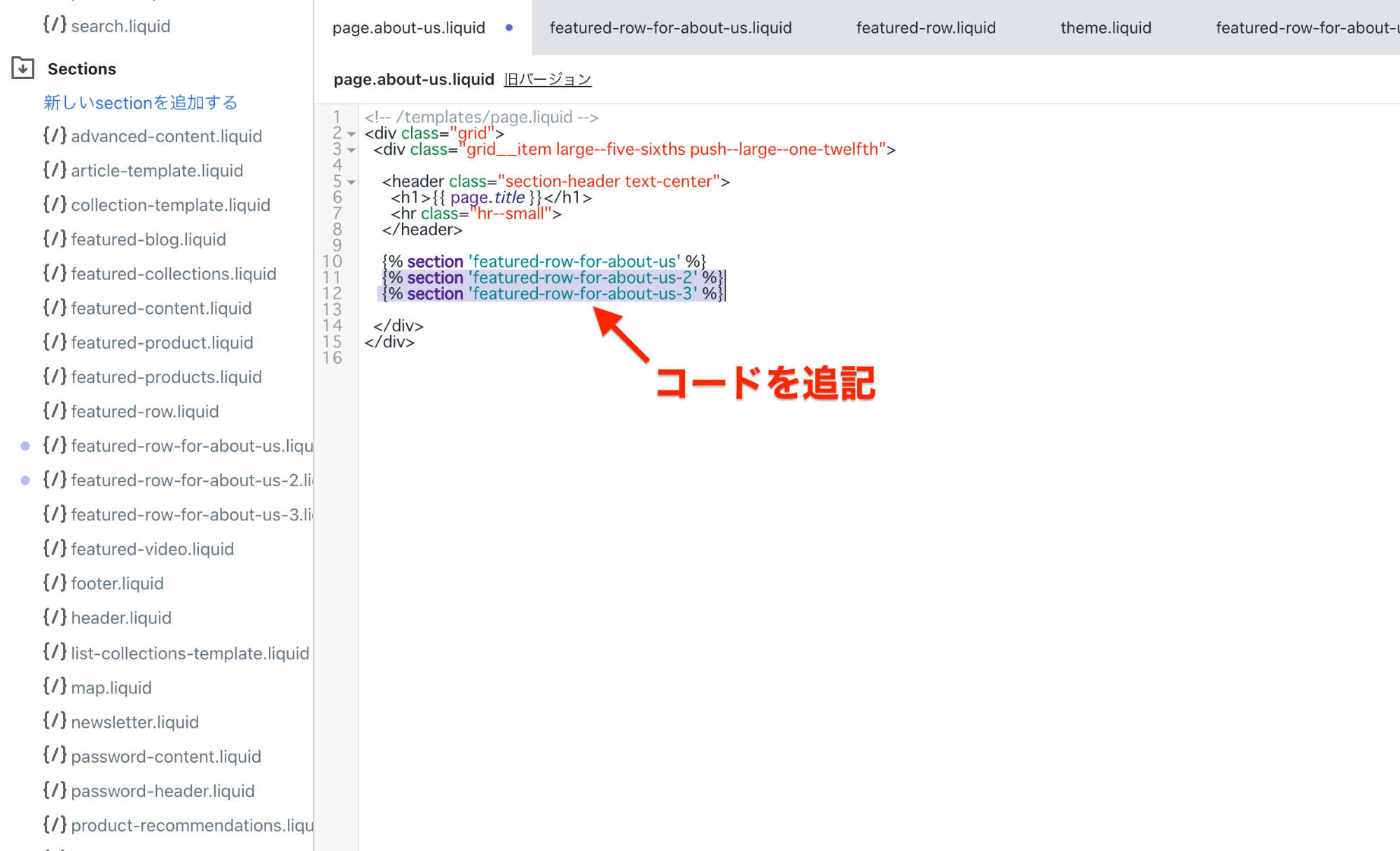 「{% section 'featured-row-for-about-us' %}」の後ろで同様に「featured-row-for-about-us-2」「featured-row-for-about-us-3」を呼び出します。以下のコードを追記してください。
