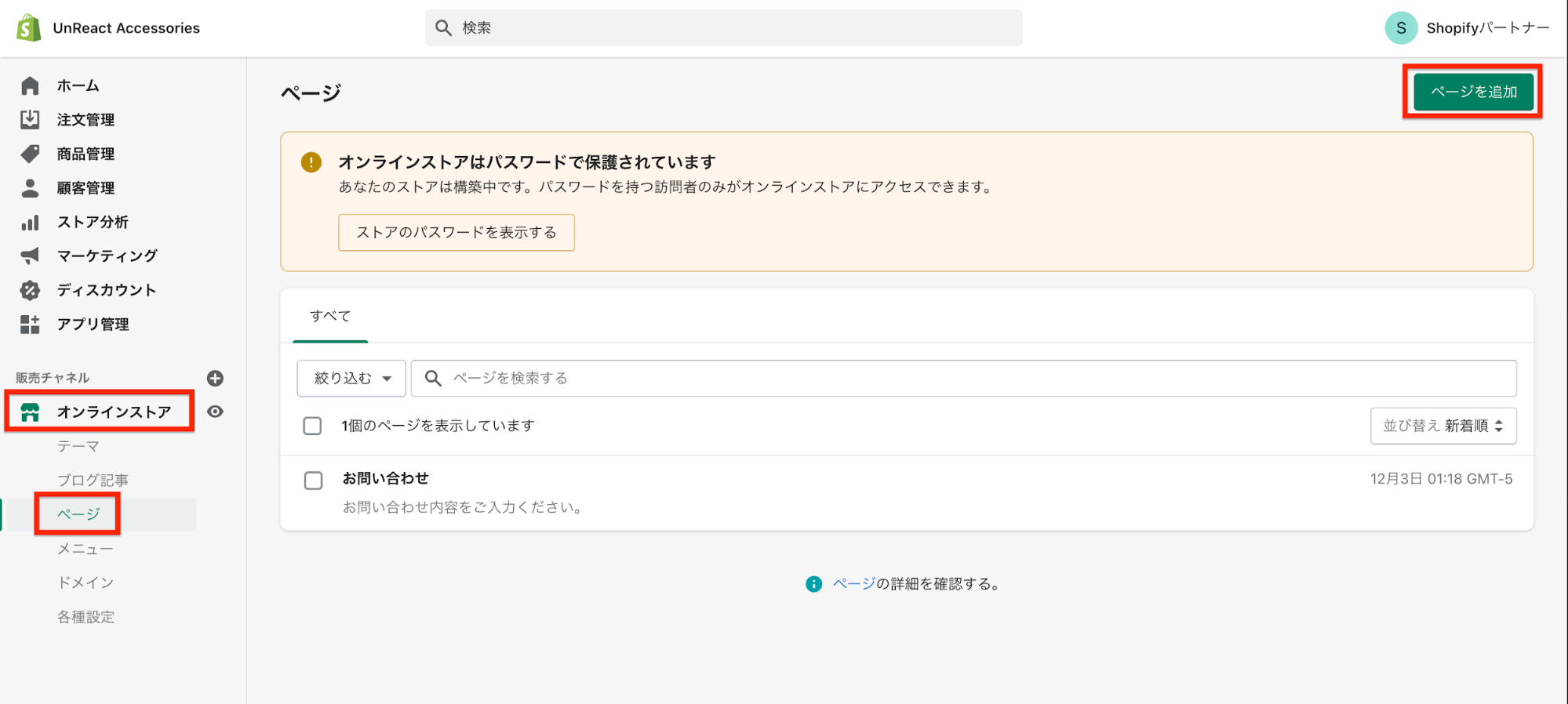 ここまでできたら、一度管理画面のタブへ移動します。「オンラインストア > ページ > ページを追加」から新規ページを作成します。前回、ページを追加する際の設定方法については一通り説明しているので、細かい部分は割愛します。