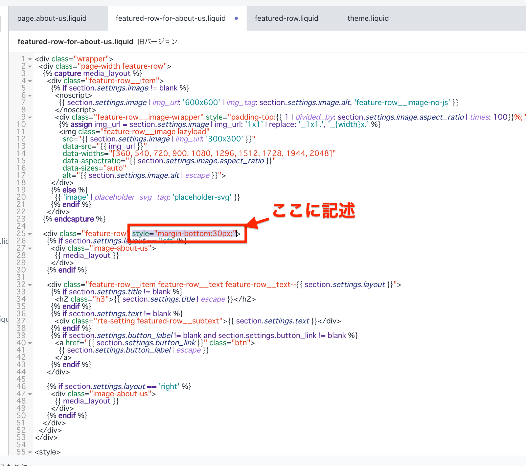 <div>タグを追加したら、CSS を記述していきます。CSS は「featured-row-for-about-us.liquid」ファイルに